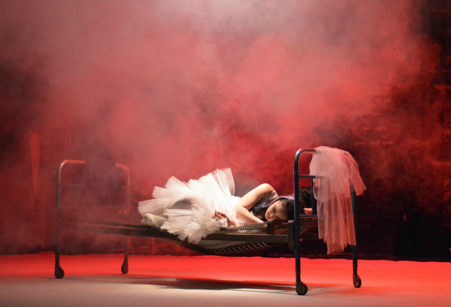 Аскетичное пространство, в центре которого расположена железная кровать с панцирной сеткой, ближе к арьерсцене стоит маленькая деревянная лошадка-качалка, а сверху — электронное табло, как на железнодорожном вокзале, где идет бегущая строка с названиями эпизодов. Динислам Тутаев строит спектакль монтажным приемом, дробя сюжет на отдельные фрагменты, лишенные линейной связи. Драматургическая фабула в спектакле оказывается лишь поводом для игры режиссерского воображения.